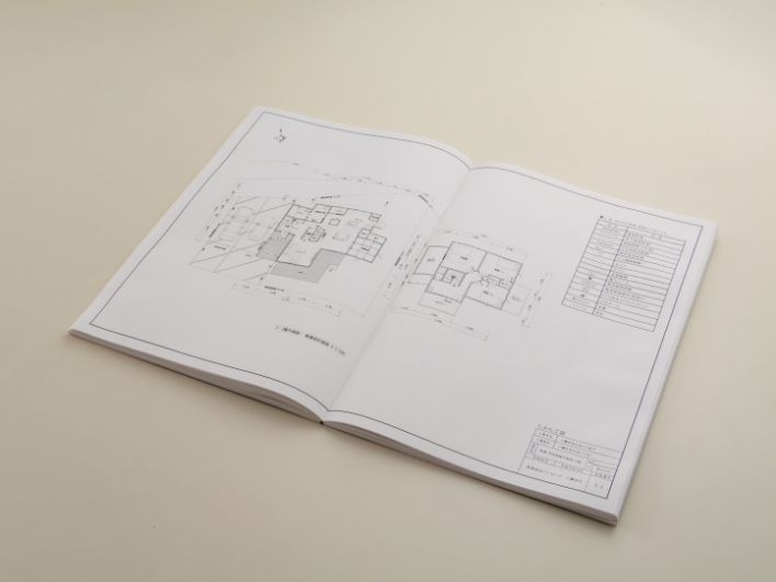 二つ折り製本(観音製本)とは、図面や書類を二つに折り、背の部分を糊付けして製本する方法です。観音開きの扉のように見えることから、この名前が付けられました。主に建設図面や設計図書、竣工図などで利用されます。180度見開きで閲覧できるため、工事現場などでよく使われます。