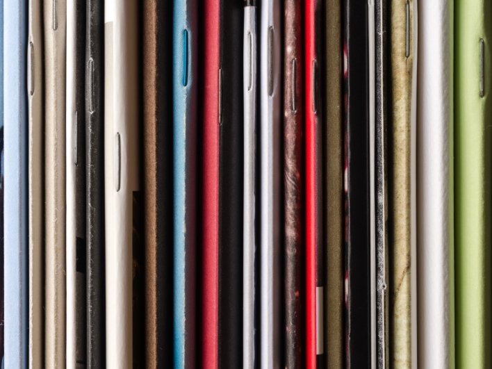中綴じ製本は、比較的ページ数の少ない冊子によく使われる製本方法で、用紙を二つ折りにし、その折り目の部分を針金や糸で綴じる製本です。背表紙がなく、見開きで開けるのが特徴です。雑誌やパンフレット、小冊子などに用いられます。